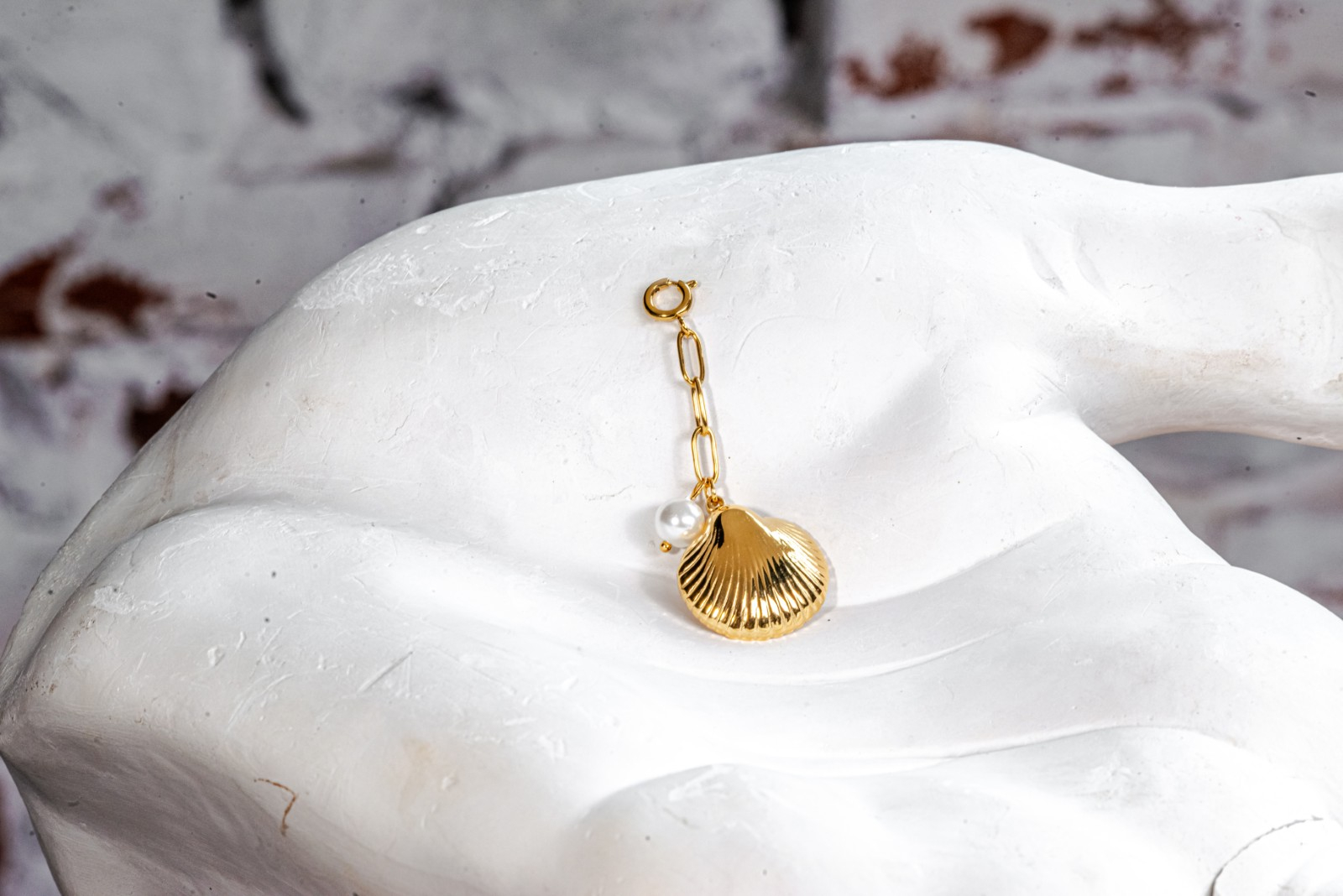 Un charm elegant, inspirat de elemente marine, cu o scoica aurie si o perla delicata atasata unui lant fin. Designul sofisticat combina stralucirea subtila a metalului cu textura neteda a perlei, oferind un aspect rafinat si expresiv. Dimensiunea compacta permite integrarea usoara in diverse bijuterii, fie pe un colier, bratara sau accesoriu personalizat.
