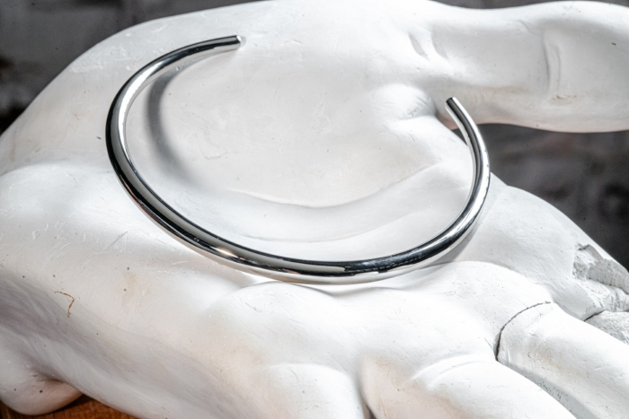 Un colier fix elegant, realizat din metal cu un finisaj lucios. Designul circular ofera un aspect modern si minimalist, iar deschiderea permite o fixare confortabila. Dimensiunile generoase fac colierul o piesa expresiva, potrivita pentru diverse tinute.