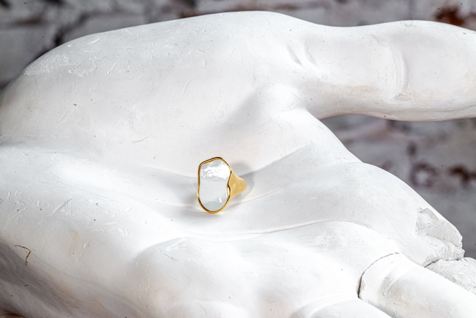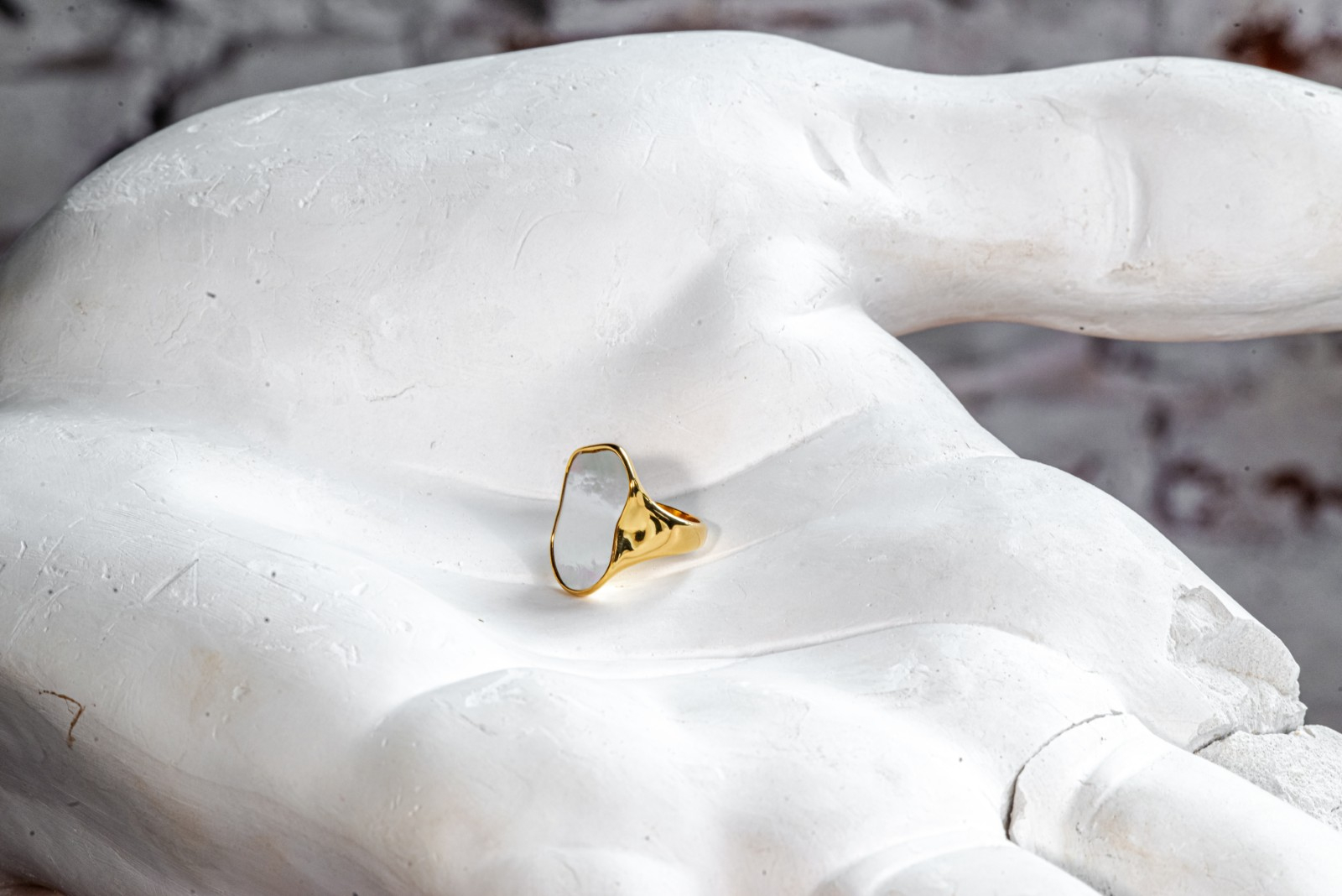 Un inel elegant, placat cu aur, cu un design simplu si rafinat. Suprafata neteda si lucioasa de sidef accentueaza caracterul minimalist al bijuteriei. Dimensiunile echilibrate si forma ergonomica asigura o purtare confortabila desi este masiv, iar finisajul stralucitor adauga un aer sofisticat accesoriului.