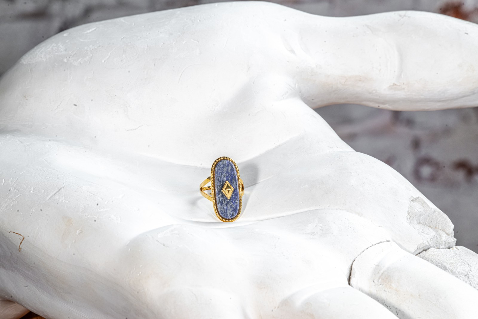 Un inel elegant placat cu aur, avand o piatra albastra alungita, decorata cu un detaliu auriu in forma de diamant in centru. Designul sofisticat imbina contrastul dintre stralucirea aurului si profunzimea nuantei de albastru. Suprafata neteda a metalului accentueaza eleganta bijuteriei.