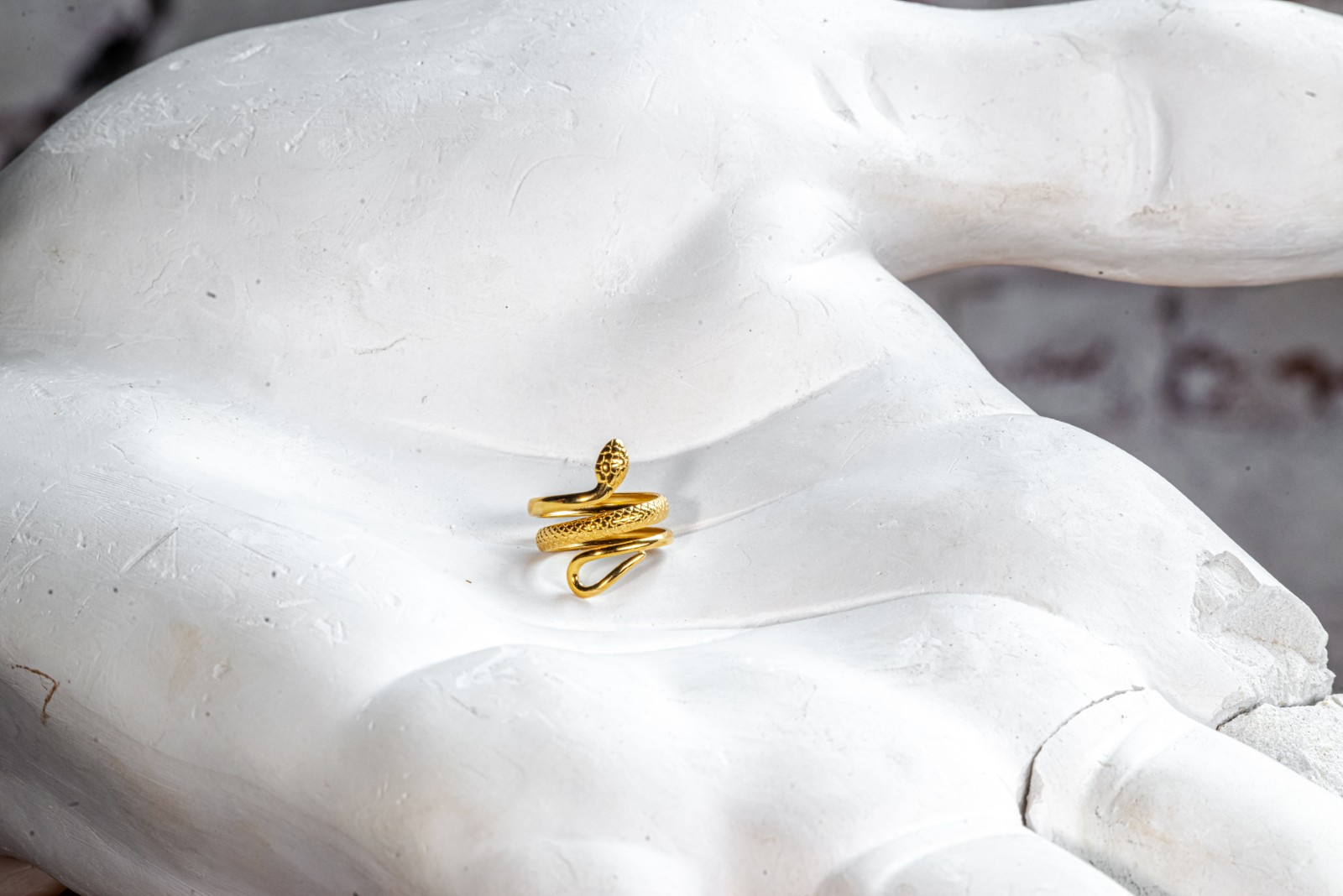 Un inel placat cu aur, avand un design inspirat din forma unui sarpe. Suprafata texturata imita solzii, iar detaliile capului si cozii sunt atent conturate pentru un efect dramatic. Forma serpuita adauga dinamism accesoriului, oferindu-i un aer elegant si expresiv.