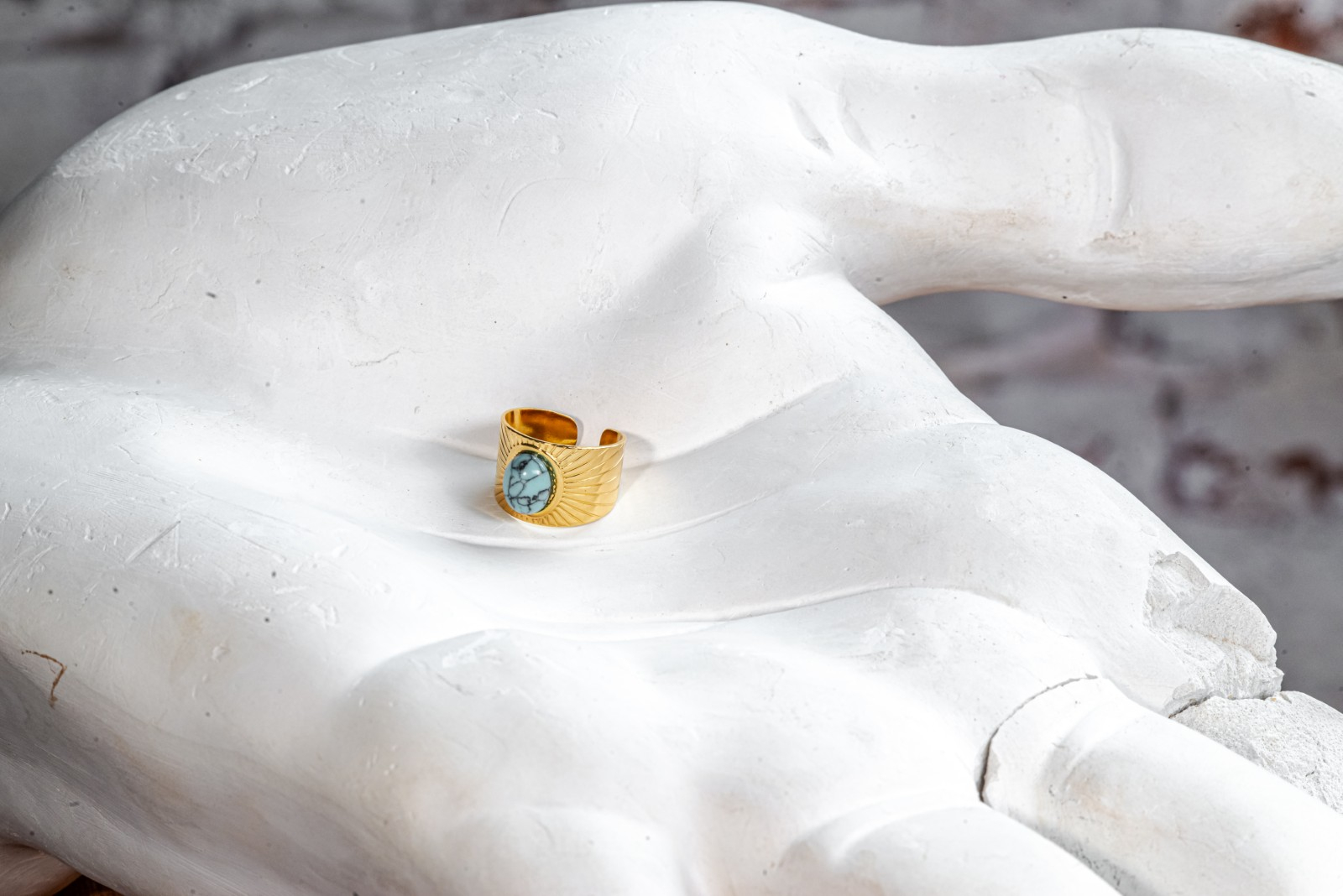 Un inel placat cu aur, avand un design distinct cu o piatra turcoaz rotunda in centru. Suprafata inelului prezinta linii gravate care radiaza din jurul pietrei, oferindu-i un efect sofisticat si expresiv. Contrastul dintre finisajul auriu si nuanta vibranta a turcoazului creeaza un accesoriu elegant, potrivit pentru diverse stiluri adaugand un accent solar.