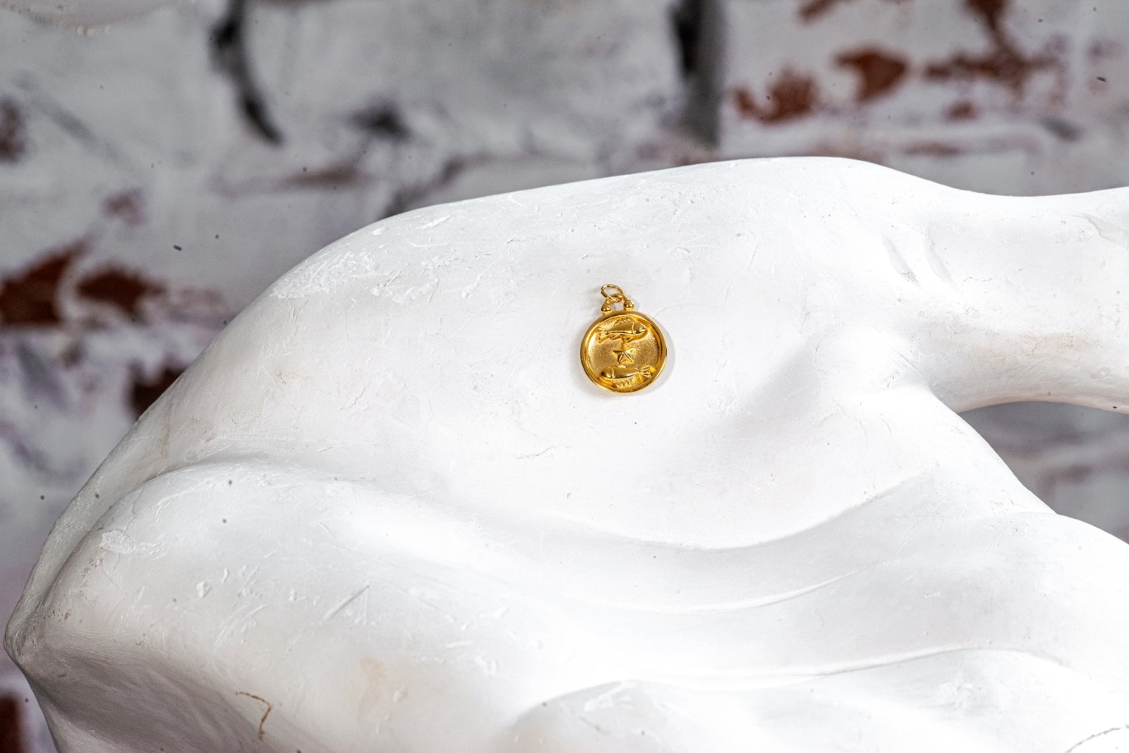 Pandantiv din otel inoxidabil placat cu aur Material: otel inoxidabil, zirconiu Placare: aur de 18K Dimensiune: 1.69 cm Greutate: 3.50 g